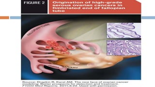 2) The types, risk factors, stages and treatment approaches for ovarian cancer including surgery to remove tumors followed by chemotherapy and targeted therapies to block blood vessel growth that enable cancer growth.