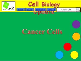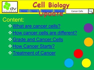 This document discusses cancer cells and how they differ from normal cells. Cancer cells continue to grow uncontrollably, do not respond to signals to stop growing or undergo apoptosis, can invade nearby tissues, and are able to spread to other parts of the body. Cancer starts due to mutations in genes that control cell growth. The grade of a cancer describes how abnormal the cancer cells appear, with higher grades looking less like normal cells. Common cancer treatments include surgery, chemotherapy, radiation therapy, and immunotherapy.