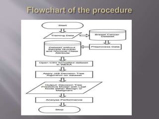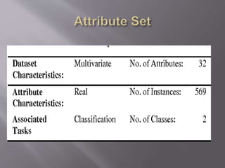 Cancer is a disease caused by abnormal cell growth and can affect different cell types. This paper focuses on breast cancer, which is classified based on the type of affected cell. There are several risk factors that can increase the likelihood of developing cancer, including gender, age, genetics, family history, weight, alcohol use, and smoking. The dataset used contains information from 569 breast cancer cases, including demographic and cell feature data. Machine learning algorithms like decision trees can be applied to build models for diagnosing breast cancer based on these attributes with up to 96.46% accuracy.