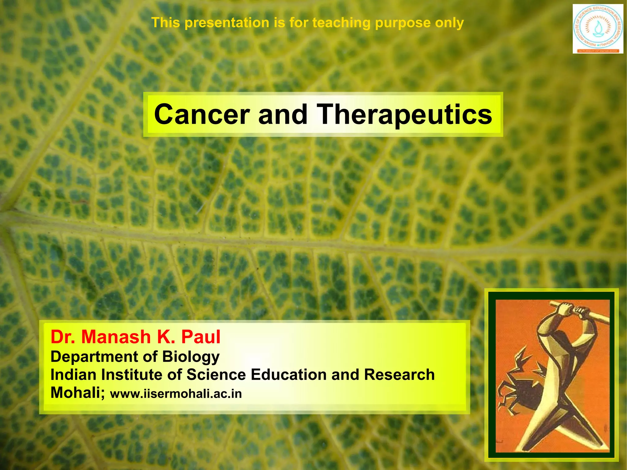 This presentation provides an overview of cancer and therapeutics. It discusses key areas that will be covered, including cell and molecular biology of cancer development, genetic pathways, cancer diagnosis and pathology, principles of cancer chemotherapy, drug discovery and delivery, and the future of cancer research. Recent papers and discussions are also mentioned.