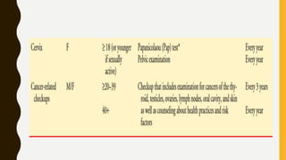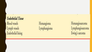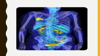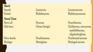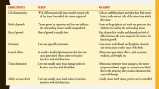 This document provides an overview of oncological disorders including definitions, characteristics of benign and malignant tumors, and imaging tests used for early cancer detection. Cancer is defined as an abnormal growth of cells that proliferate uncontrollably and can metastasize. Benign tumors tend not to spread, grow slowly, and do not require aggressive treatment, while malignant tumors can spread rapidly and require surgery, radiation, or chemotherapy. The American Cancer Society recommends various screening tests including blood tests, MRI, CT scans, ultrasound, and PET scans to detect cancers early based on tissue type and organs.