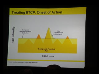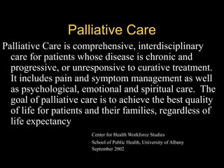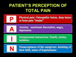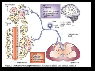 Palliative care aims to relieve suffering and improve quality of life for patients with chronic or terminal illnesses. It provides comprehensive pain and symptom management as well as psychological, emotional, and spiritual support for both patients and their families. Cancer pain is a major problem, with up to 80% of cancer patients experiencing moderate to severe pain at some point. Cancer pain can be somatic, visceral, neuropathic, or breakthrough in nature. A thorough assessment of pain is important for effective management.