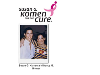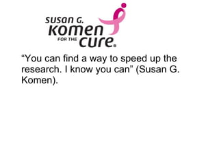 This document discusses Susan G. Komen and Nancy G. Brinker. It quotes Susan G. Komen as saying "You can find a way to speed up the research. I know you can". It also includes various citations and references to organizations and events related to breast cancer research and fundraising.