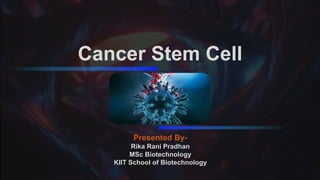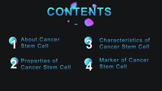 Cancer stem cells (CSCs) are a small subpopulation of tumor cells with stem-like properties, capable of self-renewal and differentiation, playing a crucial role in tumor growth and resistance to treatments. They exhibit significant heterogeneity, interact with their microenvironment, and can initiate new tumors, making them a target for novel therapies. Markers for CSCs can be categorized into surface markers and functional markers, aiding in their identification and characterization.