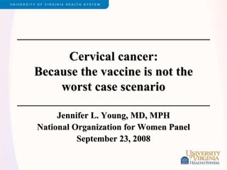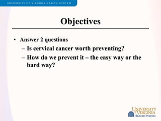 This document summarizes information about cervical cancer prevention and the HPV vaccine. It discusses the epidemiology of cervical cancer, risk factors, screening recommendations, treatment complications, and racial disparities in vaccination rates. It also addresses debates around mandating the HPV vaccine for school attendance in Virginia and paying for the vaccine. Overall, it presents both sides of the issue around preventing cervical cancer through vaccination versus traditional pap smear screening.