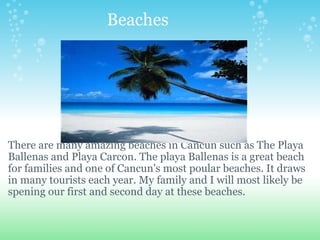 The document outlines a 7-day vacation itinerary in Cancun, Mexico. On days 1-2, the family will spend time at popular beaches like Playa Ballenas. Day 3 will be spent visiting the impressive Mayan ruins at Chichen Itza. Day 4 includes a trip to the Centro Ceremonial Kohunlich historical site. Days 5-7 involve dining at restaurants, nightlife, and beach or cultural activities in the area.