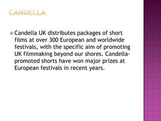Candella UK distributes British short films to over 300 festivals globally to promote UK filmmaking internationally. They have won major prizes in recent years. Best British Short Films also promotes up to 10 UK shorts selected by industry experts and aims to widely promote the films to help them win awards and funding to allow filmmakers to continue their work.