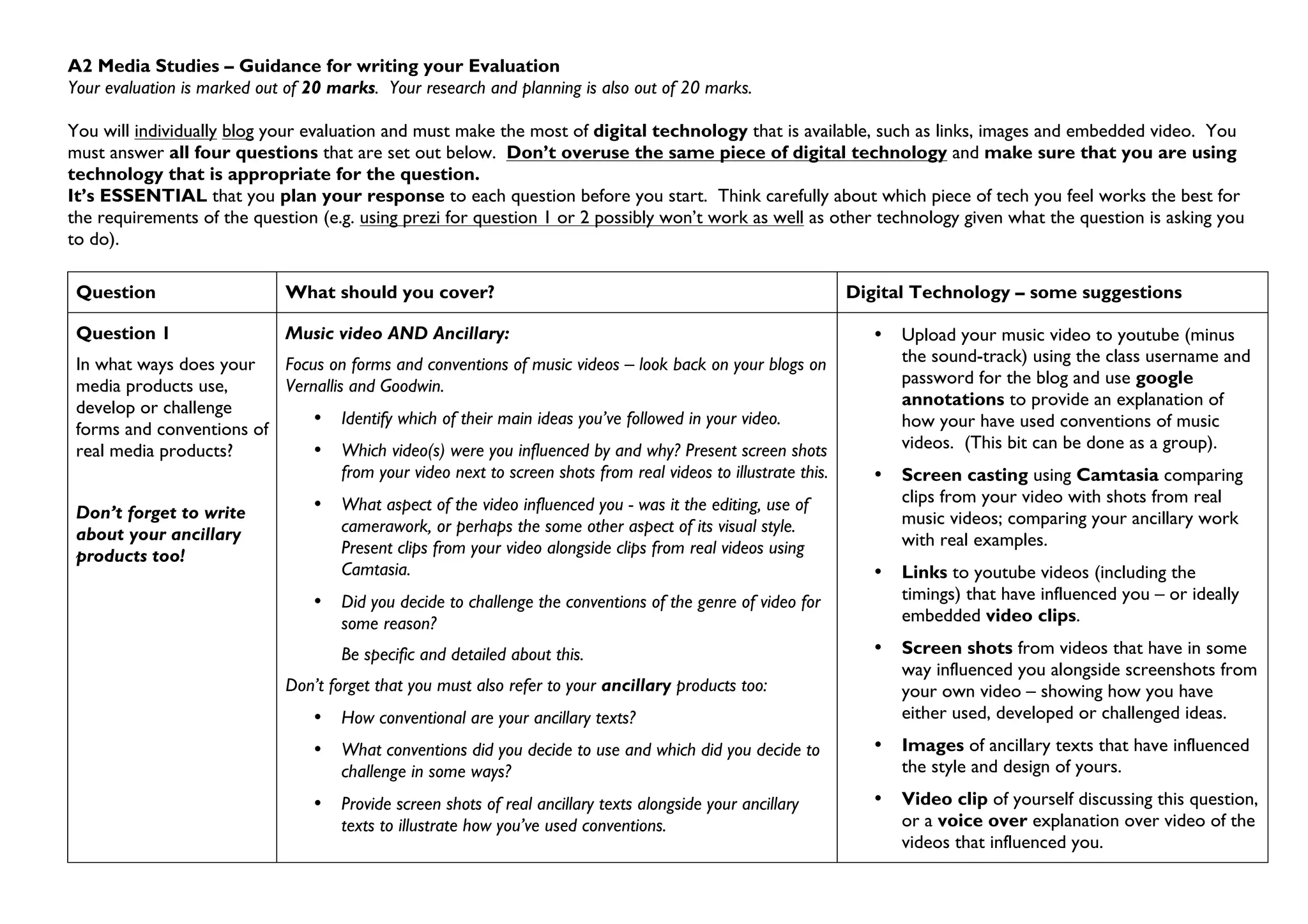 This document provides guidance for students on writing an evaluation for their A2 Media Studies course. It outlines that the evaluation is worth 20 marks and research and planning is also worth 20 marks. Students must blog their individual evaluation using available digital technologies like links, images, and videos. They must answer 4 questions, using different technologies appropriately for each question. Thorough planning of responses is essential. The document provides details on what should be covered for each question and suggests possible digital technologies to use.
