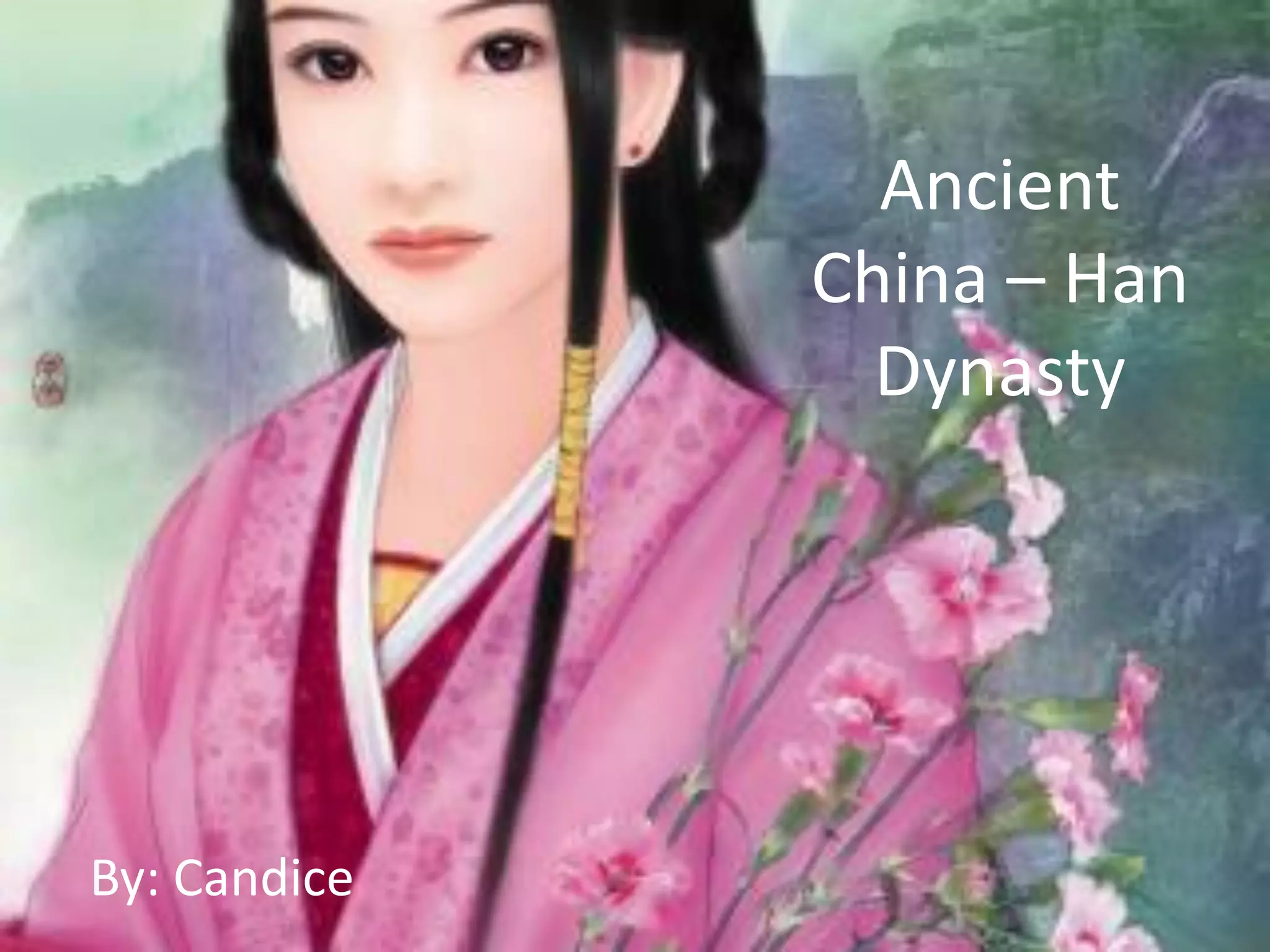The Han Dynasty ruled China from 206 BC to 220 AD. It followed the Qin Dynasty and was a period of economic prosperity and territorial expansion. The Han emperors established a strong central government and bureaucracy. Society was organized into social classes, including scholars, peasants, artisans, and merchants. Families, Confucian values, and ancestor worship were important cultural aspects of Han Dynasty China.