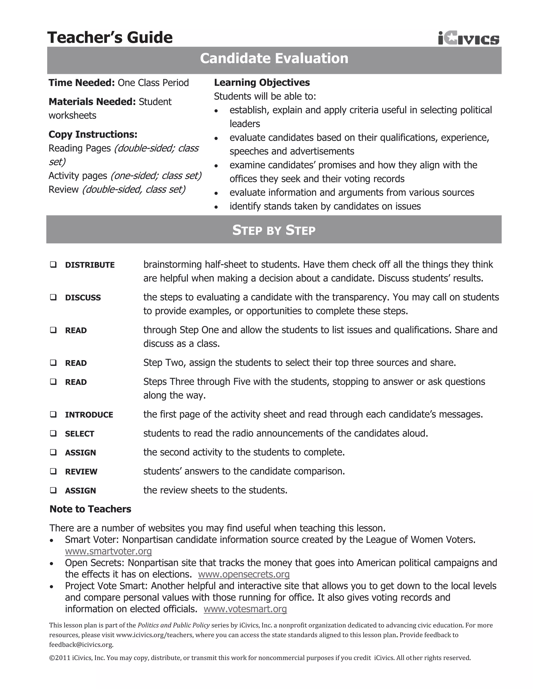 This teacher's guide provides instructions for a lesson on evaluating political candidates. The lesson objectives are for students to establish criteria for evaluating candidates, evaluate candidates based on their qualifications, speeches, advertisements and voting records, examine how candidates' promises align with the offices they seek, and evaluate information from various sources. The lesson involves students brainstorming evaluation criteria, researching candidates using various sources, comparing candidates, and reviewing what they've learned.