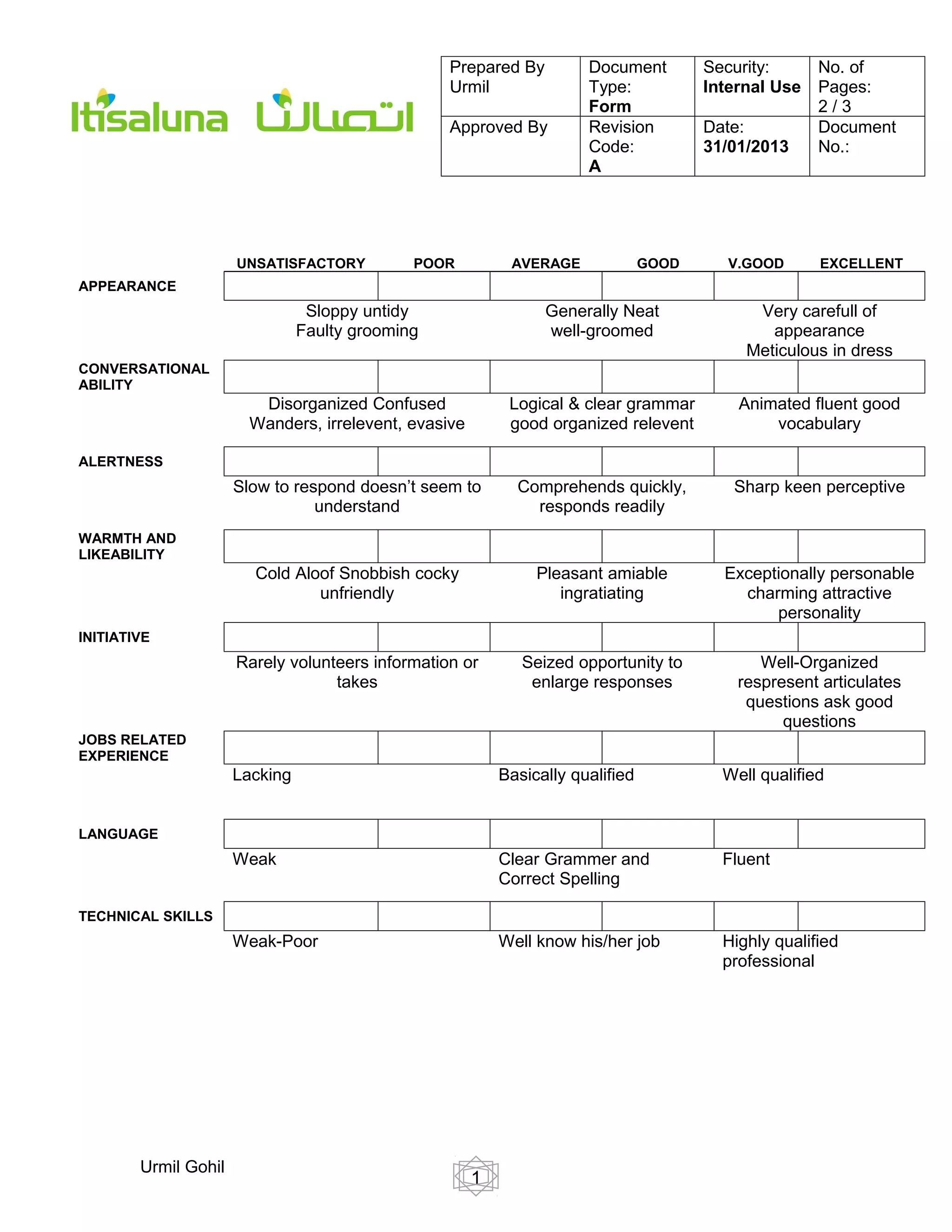 This document is a candidate evaluation form containing sections for education, career history, evaluation criteria, and recommendations. It was prepared by Urmil for internal use and reviews a candidate's education, work experience, strengths, weaknesses, salary expectations, and availability. The form allows the interviewer to assess and rank the candidate in areas such as appearance, conversation skills, initiative, and technical abilities.