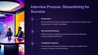 The document emphasizes the importance of a positive candidate experience in building a strong employer brand and attracting top talent. It outlines effective interview techniques, including preparation, structured interviews, and timely feedback, while also highlighting pitfalls to avoid. Strategies for engaging candidates and enhancing their experience are discussed, culminating in the need for continuous improvement in the hiring process.