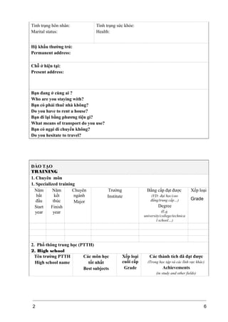 Tài liệu là mẫu đơn ứng tuyển của công ty TNHH Đại An, bao gồm thông tin cá nhân, trình độ học vấn, kỹ năng, kinh nghiệm làm việc và thông tin tham khảo. Ứng viên cần cung cấp các thông tin về vị trí ứng tuyển, dự kiến ngày làm việc, thu nhập mong muốn và các thành tích đã đạt được. Ngoài ra, ứng viên cũng cam kết tính chính xác của thông tin và đồng ý cho công ty xác minh.