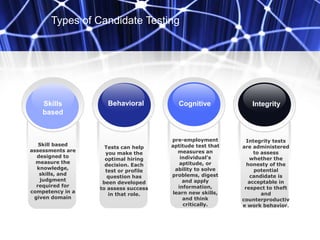 There are four main types of candidate testing: skills based, behavioral, cognitive, and integrity. Skills based tests assess a candidate's ability to apply knowledge and think critically, and are the most commonly used at 52%. Behavioral tests like the Predictive Index measure work personality and are used 38% of the time. Cognitive tests evaluate learning and problem-solving capabilities and make up 18% of assessments. Integrity tests aim to measure honesty and work ethic, the least common at 10%. Each type of test serves a different purpose in predicting job performance and success.