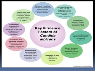 This document discusses candidiasis, caused by the yeast Candida. It begins with an introduction to mycology and the morphology of fungi. It then discusses candidiasis specifically, including its history, epidemiology, predisposing factors, pathogens involved, and pathophysiology. The document classifies the different types of candidiasis and discusses Candida in HIV patients. It covers the diagnosis and treatment of candidiasis and concludes with references.