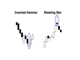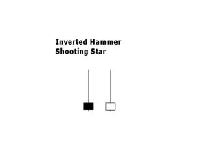 #11 The Inverted Hammer and Shooting Star look exactly alike, but have different implications based on previous price action. Both candlesticks have small real bodies (black or white), long upper shadows and small or nonexistent lower shadows. These candlesticks mark potential trend reversals, but require confirmation before action.