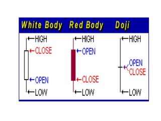 This document lists and defines various candlestick patterns used in technical analysis. It separates the patterns into bullish and bearish categories and provides the name of over 40 different candlestick patterns in each category.