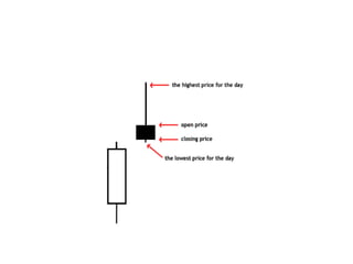 #13 Dragon fly doji form when the open, high and close are equal and the low creates a long lower shadow. The resulting candlestick looks like a "T" with a long lower shadow and no upper shadow. Dragon fly doji indicate that sellers dominated trading and drove prices lower during the session. By the end of the session, buyers resurfaced and pushed prices back to the opening level and the session high. The reversal implications of a dragon fly doji depend on previous price action and future confirmation. The long lower shadow provides evidence of buying pressure, but the low indicates that plenty of sellers still loom. After a long downtrend, long black candlestick, or at support, a dragon fly doji could signal a potential bullish reversal or bottom. After a long uptrend, long white candlestick or at resistance, the long lower shadow could foreshadow a potential bearish reversal or top. Bearish or bullish confirmation is required for both situations. Gravestone DojiGravestone doji form when the open, low and close are equal and the high creates a long upper shadow. The resulting candlestick looks like an upside down "T" with a long upper shadow and no lower shadow. Gravestone doji indicate that buyers dominated trading and drove prices higher during the session. However, by the end of the session, sellers resurfaced and pushed prices back to the opening level and the session low. As with the dragon fly doji and other candlesticks, the reversal implications of gravestone doji depend on previous price action and future confirmation. Even though the long upper shadow indicates a failed rally, the intraday high provides evidence of some buying pressure. After a long downtrend, long black candlestick, or at support, focus turns to the evidence of buying pressure and a potential bullish reversal. After a long uptrend, long white candlestick or at resistance, focus turns to the failed rally and a potential bearish reversal. Bearish or bullish confirmation is required for both situations. Before turning to the single and multiple candlestick patterns, there are a few general guidelines to cover