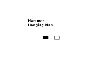 #9 The Hammer and Hanging Man look exactly alike, but have different implications based on the preceding price action. Both have small real bodies (black or white), long lower shadows and short or non-existent upper shadows. As with most single and double candlestick formations, the Hammer and Hanging Man require confirmation before action.