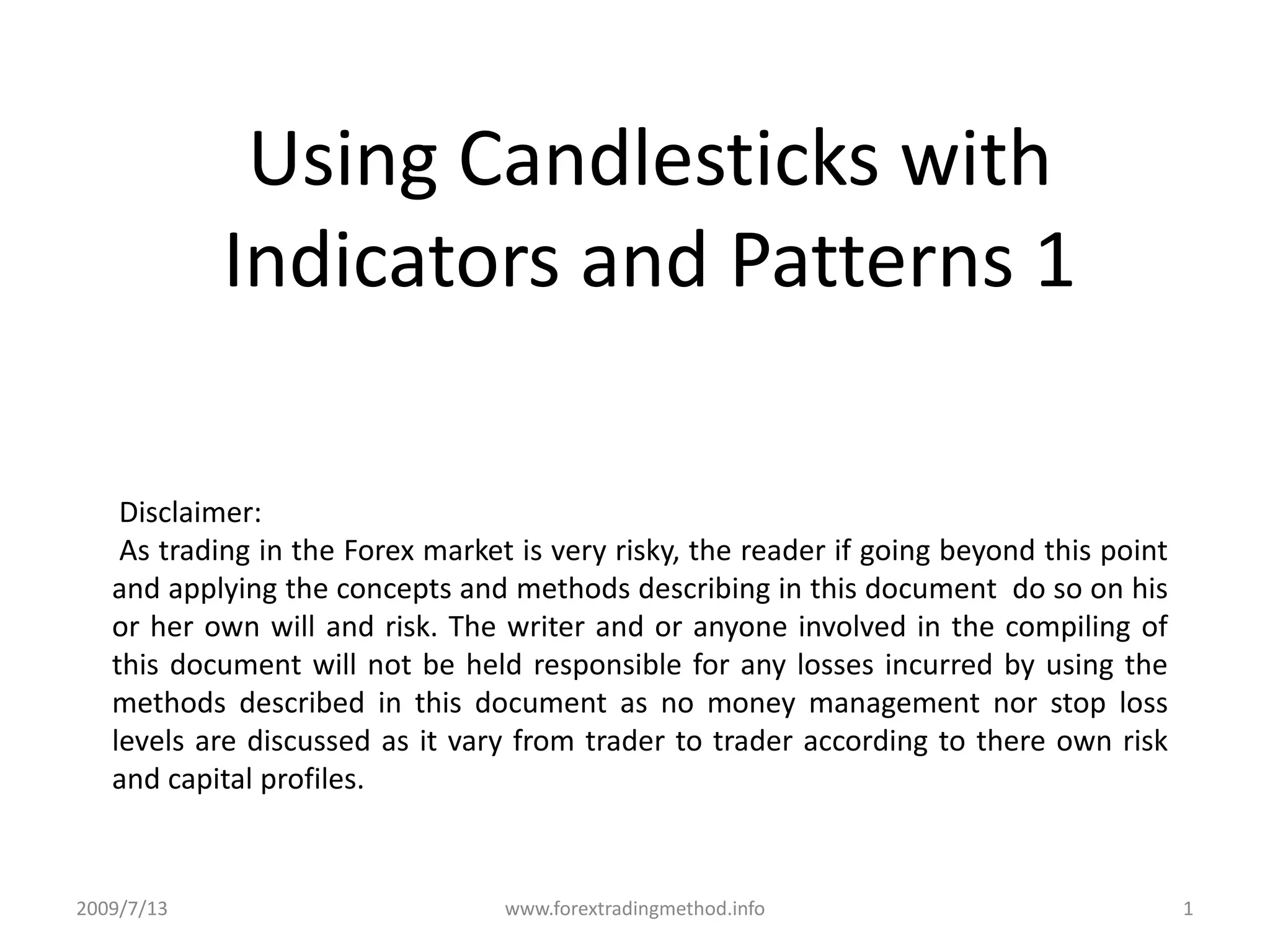 This document discusses using candlestick patterns with other technical indicators to analyze financial market psychology and obtain trading signals. Candlestick patterns can provide earlier signals than other techniques. They are pictorial and describe market participant psychology. Candlestick charts can be used alone or combined with other indicators, and they can be applied to different financial markets and time frames, making them a versatile and adaptable trading tool. Candlestick analysis has been used for over 300 years and remains an effective method.