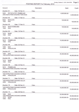The document is a posting report that lists 80 vouchers from February 2012 detailing transactions of a company. It shows debits and credits to various accounts for items like purchases, sales, payables, receivables, expenses and payroll. The last transaction on February 28th shows a debit to the payroll expense account and a credit to the payroll payable account.