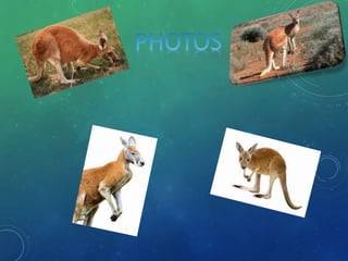 The red kangaroo lives across most of Australia except the east coast and some northern and southern areas. It is the largest marsupial and eats grass and flowers. The red kangaroo has thick fur, pointed ears, and sharp teeth adapted for eating plants. It uses its short front legs to grasp food and long hind legs and feet for powerful jumps. Though usually peaceful, the red kangaroo can be aggressive when angry. It is endangered due to hunting for its red fur.