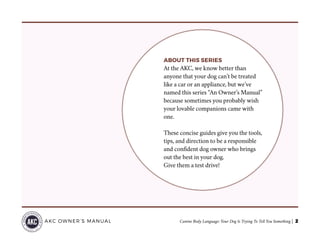 The document is an owner's manual from the American Kennel Club that explains canine body language, helping dog owners understand how their pets communicate through posture, tail movement, and other signals. It describes different emotional states such as happiness, curiosity, anxiety, fear, and aggression, emphasizing the importance of context in interpreting these behaviors. Additionally, it outlines the AKC's commitment to supporting dog welfare through various programs and resources.