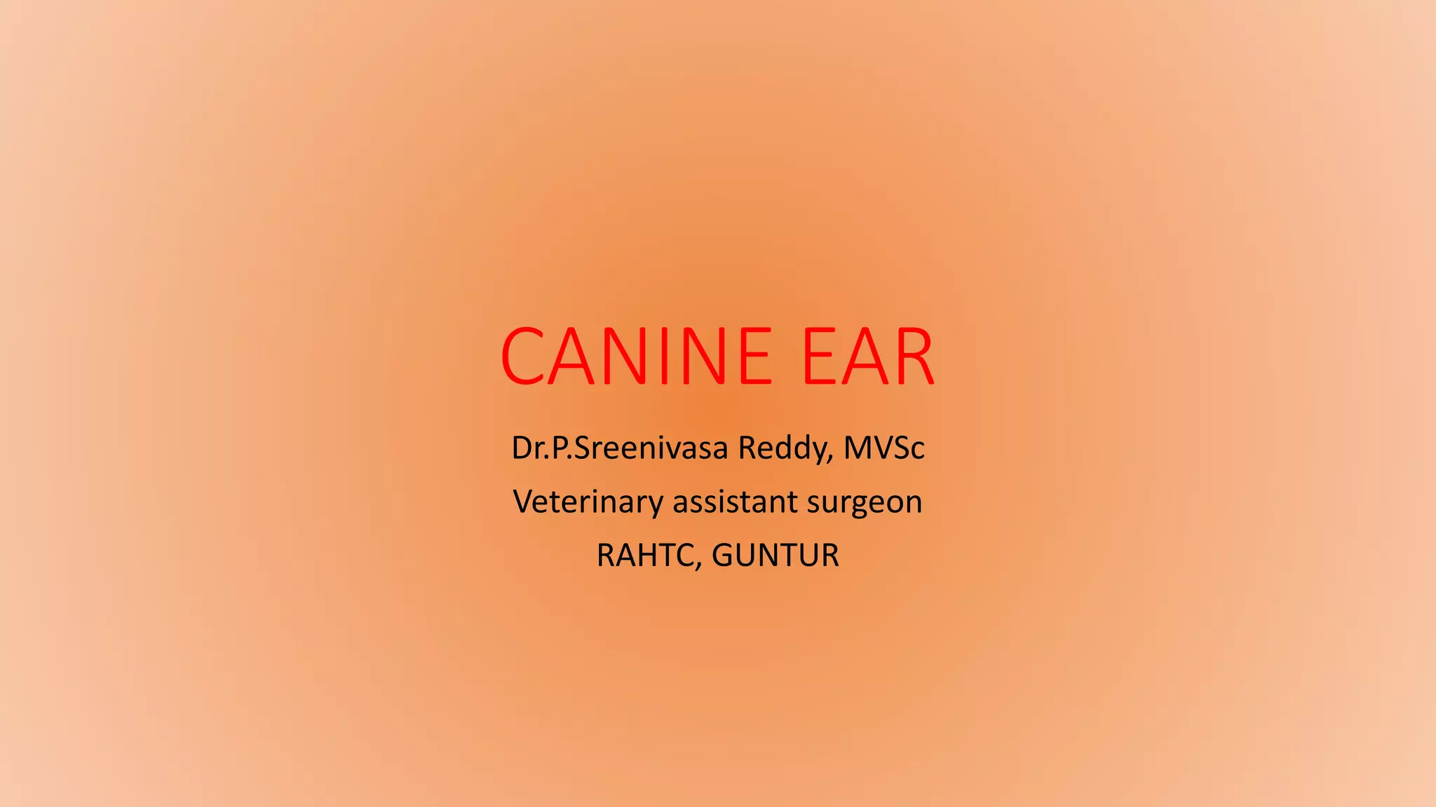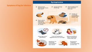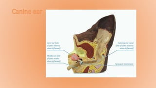 The document summarizes canine ear anatomy and function. It describes the three parts of the ear - outer, middle, and inner. The outer ear includes the pinna and ear canal. Sound is captured and funneled through the ear canal to the eardrum. The middle ear contains small bones that transmit sound vibrations to the inner ear, which includes the cochlea for hearing and vestibular system for balance. Common ear disorders in dogs are examined and diagnosed through visual inspection, use of an otoscope, samples, and further tests if needed. Causes, signs, treatment, and prevention of ear infections are discussed. The document concludes with an overview of topics to be covered in the next class