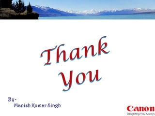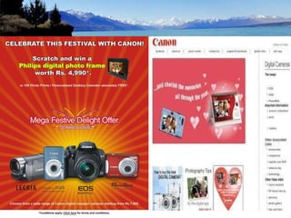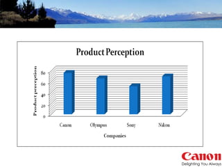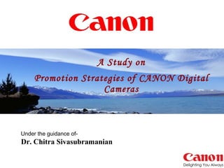 The document summarizes a study on promotion strategies for Canon digital cameras. It provides an overview of Canon as a company, details their product profile and market share. It then outlines the study's objective to understand dealer satisfaction with Canon's support. The document reviews Canon's various promotion strategies in different regions and their CSR activities. It describes the study's research methodology and findings related to dealer preferences. It concludes with recommendations to improve Canon's marketing promotions and reduce communication gaps with retailers.