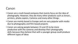 My pitch presentation for Canon journeys. The document outlines ideas for a photography project to promote Canon cameras to younger audiences. It discusses taking photos from a distance like from a hilltop or of streetlights up close or from above. It is inspired by posters for events like WWE that get their point across clearly. Examples are given of effective Canon advertisements. The proposal is to create a poster showing photos taken with a Canon camera that depict journeys or stories through unique images. Examples found online serving as inspiration show pathways, fog, and lights suggesting travel and journeys.