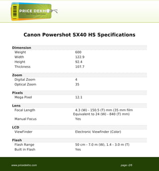 The Canon Powershot SX40 HS is a digital camera with a 12.1 megapixel CMOS sensor and a 35x optical zoom lens ranging from 24-840mm (35mm equivalent). It has a 2.7 inch LCD screen, full manual controls, and can capture video in MOV format. The camera is powered by a NB-10L lithium ion battery and has connectivity options like HDMI and USB ports.