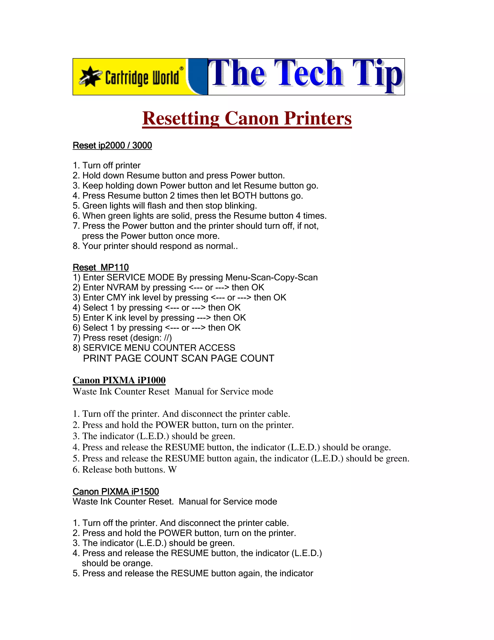 This document provides instructions for resetting the waste ink counter on various Canon printer models. The instructions involve putting the printers into a service mode by pressing specific button combinations, then selecting an option to reset the waste ink counter. Resetting clears the counter to allow for refilling ink tanks without triggering an error. The steps vary slightly between printer models but generally involve turning off the printer, pressing and holding specific buttons, then selecting a reset option using button presses.