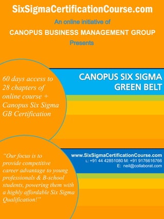 Canopus Business Management Group offers a 60-day online Six Sigma certification course consisting of 28 chapters to help young professionals and business students gain a competitive career advantage. For a highly affordable price, students can earn Canopus' Six Sigma Green Belt certification and access over a month of online learning materials and guidance to become qualified in Six Sigma methodology and techniques.