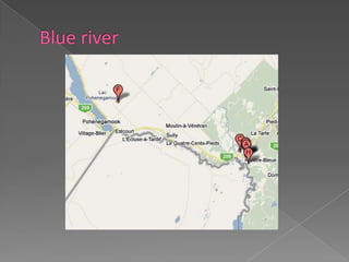 The document summarizes a 5-day canoe trip taken by the author and their friends Cassandra, Véronic and Alice along the Blue River in Quebec. On the first day they paddled for 3 hours from Lac Pohénégamook and stopped in Estcourt. The second day they paddled for 6 hours with stops to look at the landscape and eat before stopping in L’Écluse-à-Tardif. The third day they paddled for 5 hours before stopping for the day. The fourth day they stopped after 6 hours of paddling due to rain. The fifth and final day they finished the trip with 8 hours of paddling.