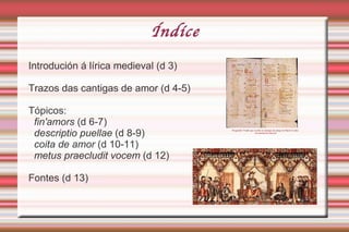 Introdución A líricatrobadoresca en galego-portuguesa nace do contacto cos trobadores occitanos. Co camiño de Santiago a corte compostelá convértese en centro de peregrinaxe e vía de entrada das innovacións poéticas cultivadas nas refinadas cortes provenzais. A cantiga de amor é o xénero máis provencializante da nosa lírica (< cançó ). Figuras conceptuais (antíteses, paradoxos, parodia, ironía) e formais (dobre, mordobre). Conservánse nos códices en 1º lugar: 377 de refrán e 321 de mestría.