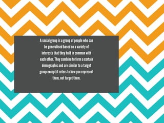 This document discusses how the media product represents various social groups through its characters. It analyzes characters inspired by Nicolas Cage in Face Off, Glenn Close in Fatal Attraction, Uma Thurman's bride in Kill Bill. The fiancé character represents adulterers, taking cues from Cage's character being unfaithful despite his family life. The mistress character represents mistresses and draws from Close's psycho character plotting to kill her lover's family. The fiancée represents scorned women, relating to the bride seeking revenge after being left at the altar in Kill Bill. Cinematography, costumes, and narratives were inspired by these films to portray the characters and social groups.