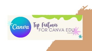 Canva is a free online graphic design platform that allows users to create professional-looking visuals easily. It provides educators over 420,000 templates to design classroom materials like presentations, worksheets and videos. Educators can also use Canva's brand kit feature to maintain a consistent visual style across their materials. Additional tools like presentation recording, collaborative workspaces and advanced design features allow educators to create engaging content for students.