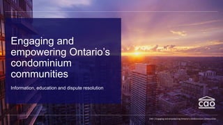 The Condominium Authority of Ontario (CAO) was created to engage and empower Ontario's growing condominium community. CAO provides information, education, and dispute resolution services for condo boards and owners. It was established in 2017 as a not-for-profit organization following public consultations and legislative changes. CAO offers online resources, training for board directors, and guides residents through dispute resolution processes to help manage issues within condo communities.