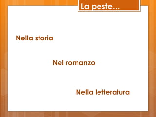 Il documento esplora la peste nella storia e nella letteratura, dettagliando eventi significativi del 1628-1630 in Italia, dove epidemie e carestie portarono a tumulti e stravolgimenti sociali. Attraverso personaggi come don Rodrigo e Cecilia, viene analizzato il cambiamento nell'animo umano e le reazioni collettive alla calamità, evidenziando momenti di follia, salvezza e dignità. Inoltre, si esaminano le rappresentazioni della peste in opere letterarie di autori come Tucidide, Boccaccio, Defoe, Poe e King, illustrando il suo impatto sulla società e sulla cultura.