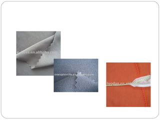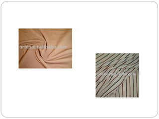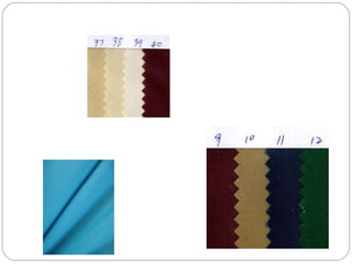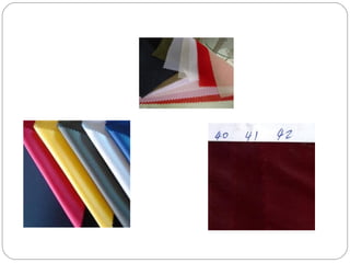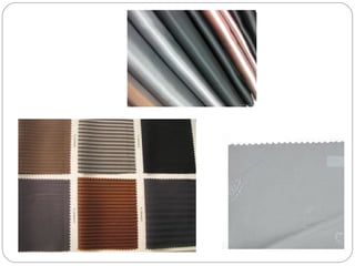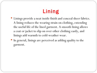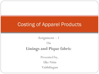 The document discusses different types of linings and fabrics used in apparel costing, including their uses, suppliers, and pricing. It covers polyester, viscose, and taffeta linings as well as cotton and polyester pique fabrics. Suppliers listed are both international, primarily in China, and national, based in India. Cost ranges provided are in US dollars per meter or kilogram.