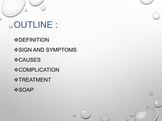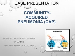 This document presents a case study of community-acquired pneumonia (CAP) in a 77-year-old male patient. It outlines the definition, signs and symptoms, causes, complications and typical treatment approaches for CAP. It then details the specific patient's medical history, vital signs, lab results, physical exam findings and assessments. The treatment plan outlined includes antibiotics, steroids and other medications to treat the pneumonia, hypertension and prevent further complications.