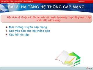Tài liệu cung cấp thông tin về các loại cáp mạng như cáp đồng trục, cáp xoắn đôi và cáp quang, bao gồm đặc điểm kỹ thuật, cấu tạo và ứng dụng của từng loại. Nó cũng đề cập đến các yếu tố cần xem xét khi thi công hệ thống cáp mạng để đảm bảo an toàn và chất lượng. Ngoài ra, tài liệu bao gồm các câu hỏi ôn tập liên quan đến các chủ đề đã trình bày.