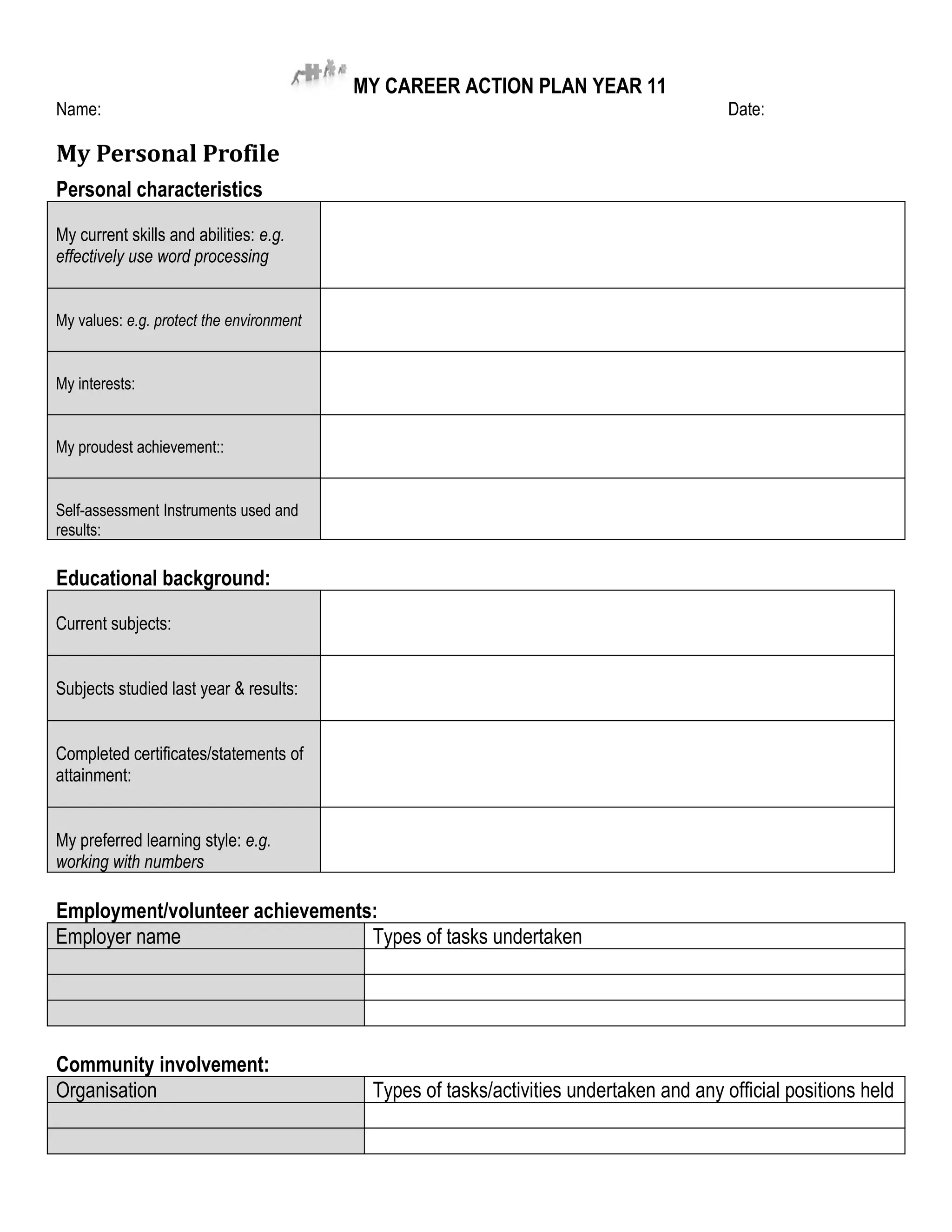 This document outlines a student's career action plan for year 11. It includes a personal profile with skills, values, and interests. Educational background and current subjects are provided. First and optional career choices are listed, along with further education and training requirements. Occupational outlook and employment predictions are given for each choice. Goals from last year are reviewed and areas needing development are identified. Resources and support systems are listed to help achieve career goals. A career planning checklist is included to update the student's portfolio. The student reflects on progress and makes changes to goals as their ideas become clearer.