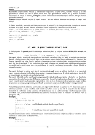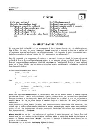 Capitolul 6 discută structura funcțiilor în programarea C/C++, incluzând antetul, corpul, apelurile și prototipurile funcțiilor. Se explorează diverse metode de transfer al parametrilor, cum ar fi prin valoare, pointeri și referință, subliniind importanța variabilelor locale și a domeniului de vizibilitate. De asemenea, documentul include exemple de cod pentru ilustrirea conceptelor de bază legate de funcții.