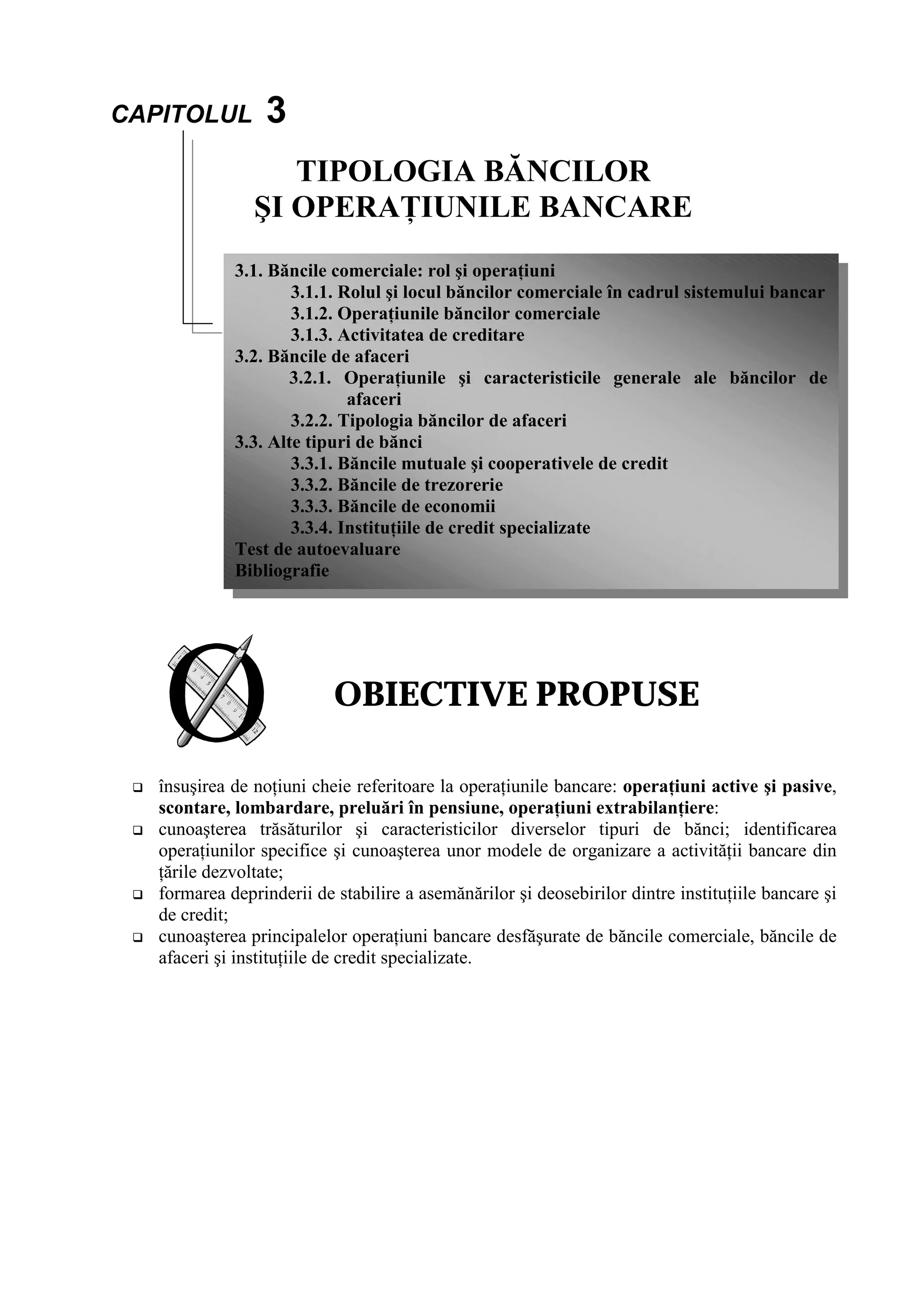 Capitolul 3 analizează tipologia băncilor și operațiunile acestora, incluzând băncile comerciale, băncile de afaceri și alte tipuri de instituții financiare. Băcile comerciale joacă un rol esențial în sistemul bancar, având diverse operațiuni active și pasive, precum și activități internaționale. De asemenea, se discută despre influența globalizării asupra naturii operațiunilor bancare și despre specificitățile mai multor tipuri de bănci în funcție de legislația națională.
