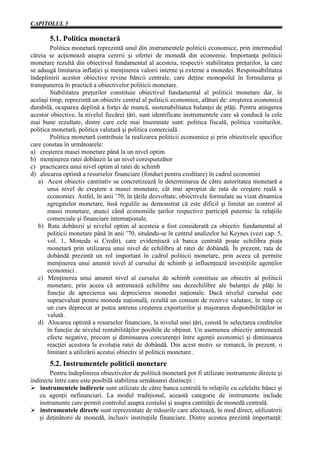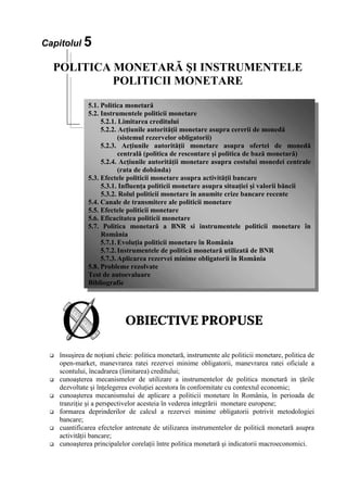 Capitolul 5 analizează politica monetară și instrumentele acesteia, concentrându-se pe obiectivele principale precum stabilitatea prețurilor și limitarea inflației. Se discută despre instrumentele utilizate de băncile centrale, cum ar fi limitarea creditului, rezervele obligatorii și politica de dobândă, precum și impactul acestora asupra activității bancare și economiei. Politica monetară în România este de asemenea evaluată, evidențiindu-se evoluțiile și metodele aplicate de Banca Națională.