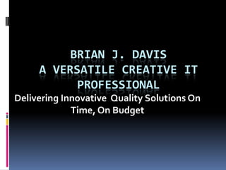 BriaN J. Davis is a versatile creative IT professional specializing in network architecture, project management, RFP construction, proposal preparation, and ITIL compliant process development. He has experience analyzing existing networks, developing new architectures, managing projects, constructing RFPs, writing proposals, improving IT processes, and implementing asset management systems and procedures.