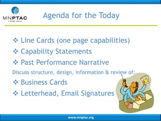 The document discusses marketing materials for small businesses seeking government contracts, including capabilities statements, past performance narratives, business cards, and email signatures. It provides guidance on what information to include in one-page capabilities statements to concisely convey a company's qualifications, competencies, and differentiation. It also outlines what should be included in past performance narratives and recommendations for designing clear and informative business cards and email signatures. The overall goal is to effectively communicate a company's capabilities and value proposition to government customers.
