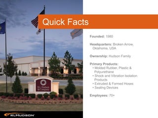RL Hudson is a manufacturer of molded rubber, plastic, and polyurethane products headquartered in Oklahoma that was founded in 1980. It employs over 70 people and offers advantages to customers in five key areas: product design and engineering, material technology, quality assurance, supply chain management, and a wide product range. It provides services from product design through material selection, development, and finished product testing.