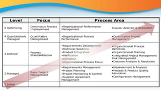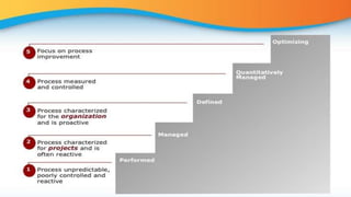 The Capability Maturity Model Integration (CMMI) is a framework developed to improve organizational processes, aiding in understanding and measuring performance. It defines five maturity levels, ranging from initial, where success relies on individual effort, to optimizing, which focuses on continual process improvement. Adopting CMMI can lead to benefits such as consistency, cost savings, and enhanced market and performance demands.